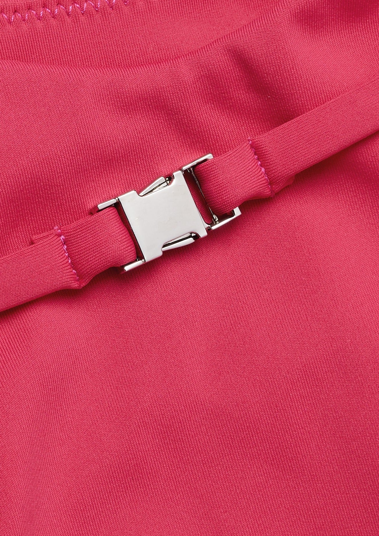 Take a daring plunge in the Capri Bikini Swim Bottom! This bold Spanish Crimson bottom features a V-contoured waistband, a high-leg cut and cheeky back coverage for a look that will turn heads. Waist belt with mini silver buckle is removable for customizing your style. Spice up your look with the Julie or Daniella bra top, and Olivia ultra crop, to make your splash!